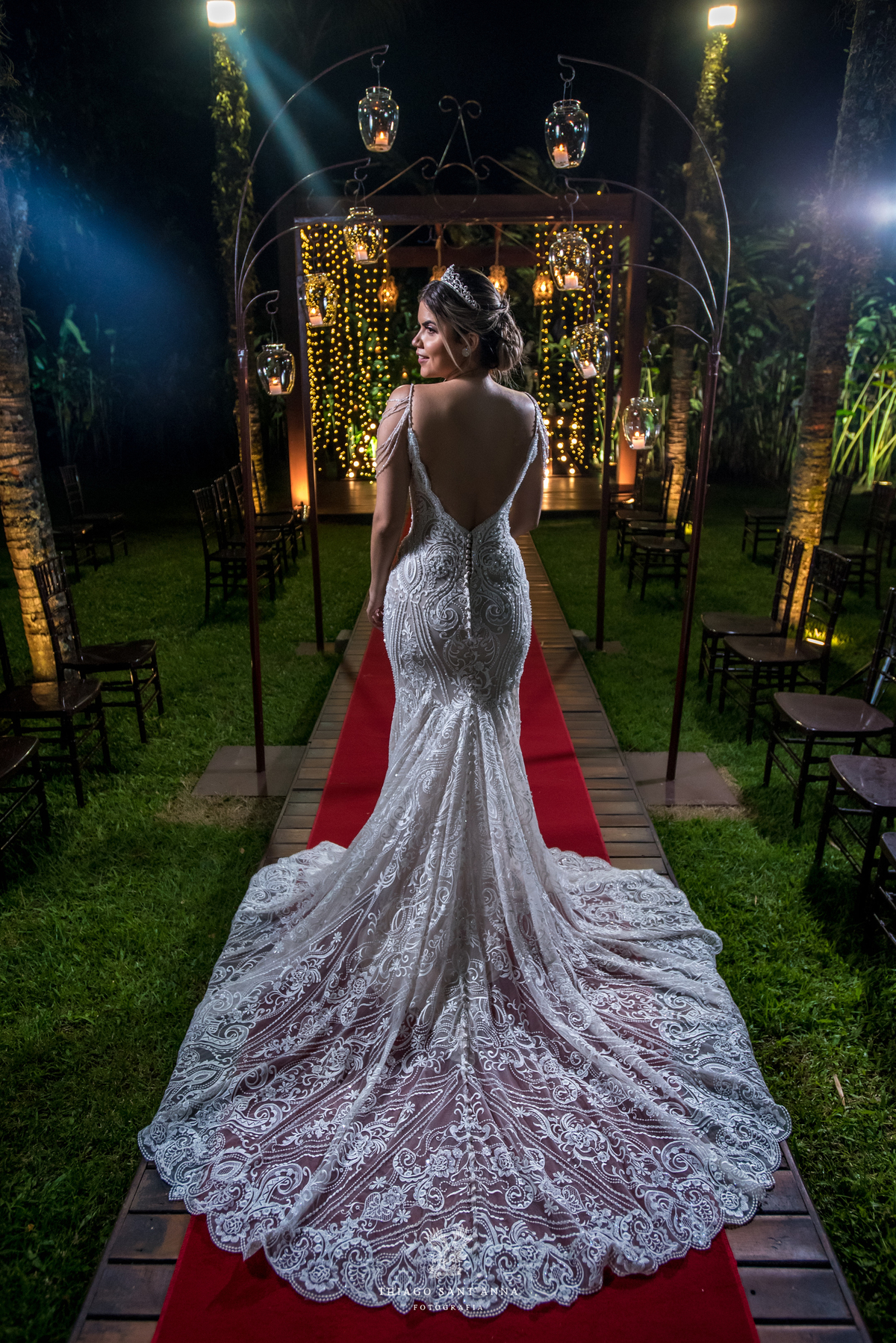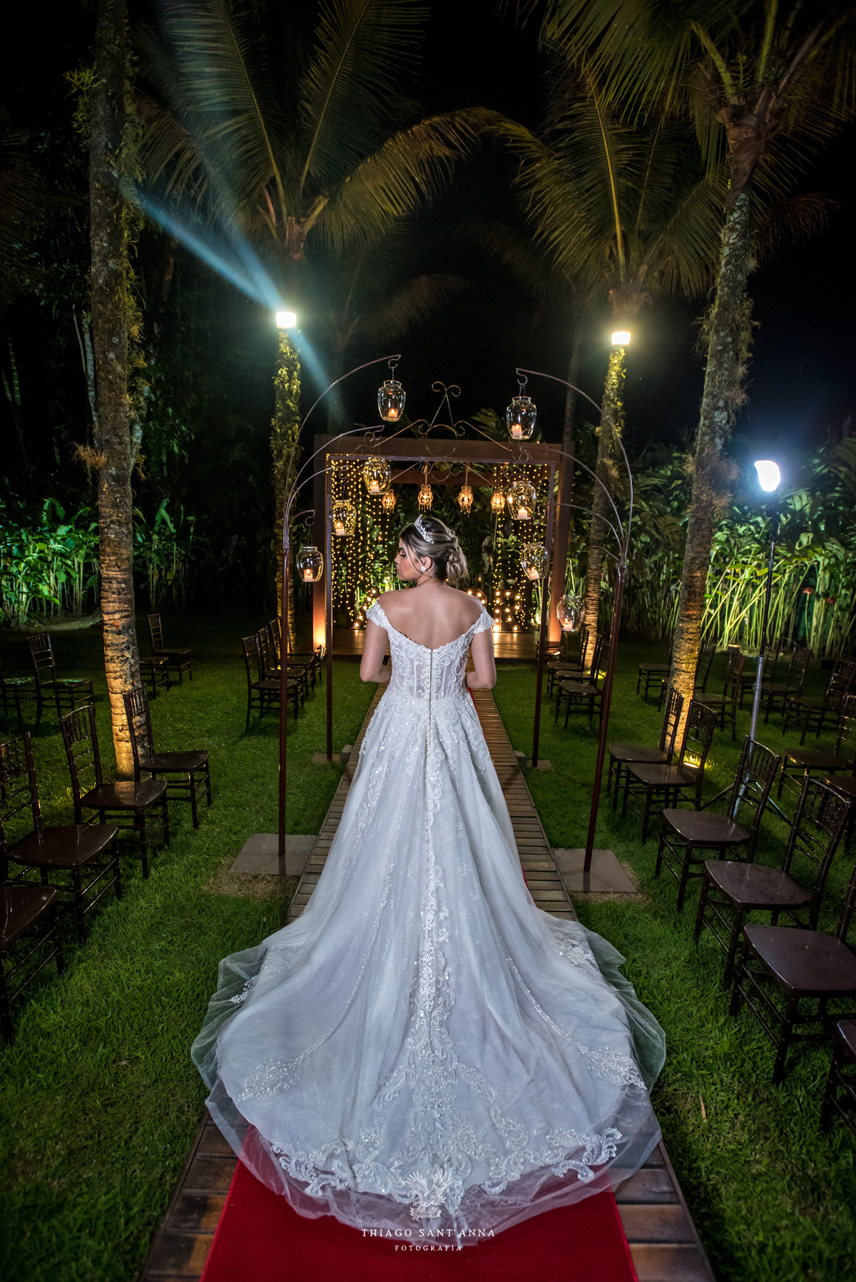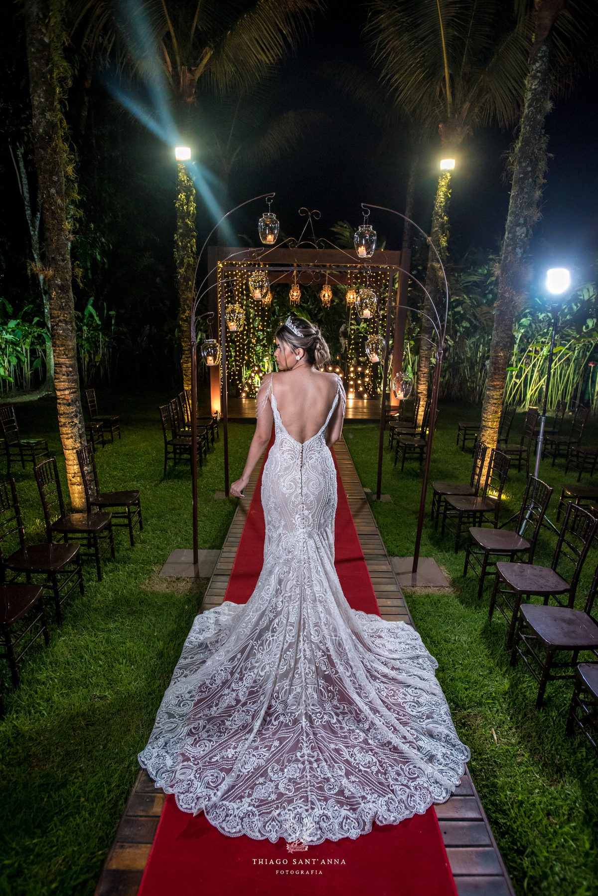 cobertura desfile estrutura madeira luminárias luzes ambiente externo vegetação palmeiras